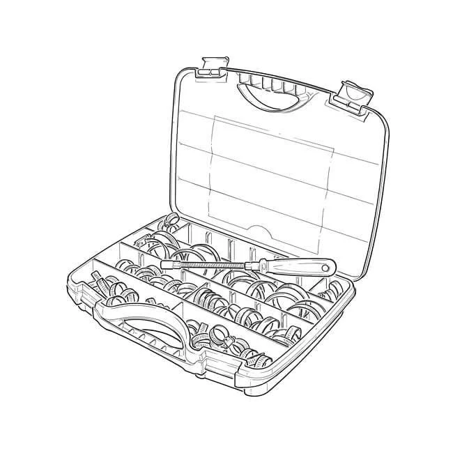 Assorted sizes of the ASFA-L W2, 9 mm wide stainless steel hose clip which have a stamped band thread, smoothed on the underside with bevelled band-edges and a zinc-plated mild steel screw. The different diameters of clip are arranged in individual compartments in the PVC case.