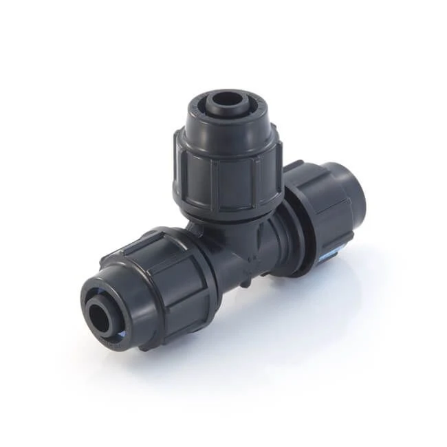 Barrier MDPE Puriton® equal tee manufactured from polypropylene and supplied with integral inserts, grip rings and o-ring seals.