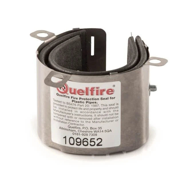 Quelfire® QWR fire stop seals and Quelfire® QWW Intuwraps prevent the spread of fire, smoke and hot gases through plastic pipes which penetrate fire compartment walls and floors. They are suitable for any type of building where a fire compartment wall or floor is penetrated by plastic pipes of 40 – 110 mm overall diameter. STANDARD Specification CLAUSE. Install correct size Quelfire® QWR and QWW. Install in accordance with manufacturer’s instructions. Material tested to BS476-20:1987 to maintain fire resistance of up to 4 hours.