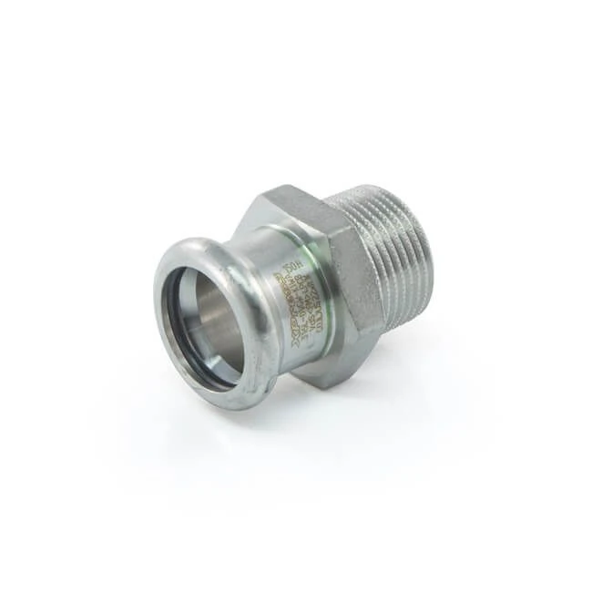 Press-fit 22 mm x ¾” BSP TM Connector- XPress 316L Stainless steel fitting designed for use on potable water (including water purified by reverse osmosis), pharmaceutical, health care, food processing, low temperature hot water and chilled water applications. Press fitting ends have a Leak Before Press (LBP) feature to indicate if joint has not been pressed. For identification fitting has EPDM black O-rings. Fitting provides electrical continuity when pressed. Fitting should not be painted or come into contact with cleaning products, paint, grease, flux, mineral oil, adhesive or other solvent based materials during installation, lagging or after installation. For installation of the fitting a REMS tool and tongs are required.